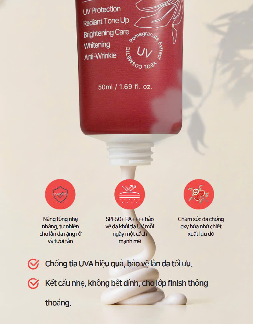 Thành Phần: Water, Cyclopentasiloxane, Dimethicone, Ethylhexyl Methoxycinnamate, Cyclohexasiloxane, Dicaprylyl Carbonate, Butylene Glycol, Cetyl PEG/PPG-10/1 Dimethicone, Squalane, Zinc Oxide, Titanium Dioxide, Ozokerite, Silica, Sodium Chloride, Niacinamide, Sorbitan Stearate, Disteardimonium Hectorite, Trihydroxystearin, Sorbitan Sesquioleate, Dimethicone/Vinyl Dimethicone Crosspolymer, Punica Granatum (Pomegranate) Fruit Extract, Centella Asiatica Extract, Polygonum Cuspidatum Root Extract, Scutellaria Baicalensis Root Extract, Glycyrrhiza Glabra (Licorice) Root Extract, Sodium Acetylated Hyaluronate, Sodium Hyaluronate, Hydrolyzed Hyaluronic Acid, Camellia Sinensis Leaf Extract, Paeonia Lactiflora Root Extract, Polygonum Multiflorum Root Extract, Phellinus Linteus Extract, Morus Alba Bark Extract, Sophora Flavescens Root Extract, Cimicifuga Racemosa Root Extract, Sesamum Indicum (Sesame) Seed Extract, Angelica Gigas Root Extract, Panthenol, Chamomilla Recutita (Matricaria) Flower Extract, Rosmarinus Officinalis (Rosemary) Leaf Extract, Centella Asiatica Leaf Extract, Portulaca Oleracea Extract, 1,2-Hexanediol, Triethoxycaprylylsilane, Caprylyl Glycol, Aluminum Hydroxide, Adenosine, Ethylhexylglycerin, Disodium EDTA, Fragrance.